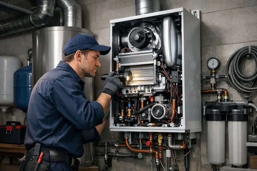 Накипь — главный враг экономичности. Слой всего в пару миллиметров действует как теплоизоляция, заставляя котёл работать дольше и интенсивнее. Инженер при осмотре обращает внимание на: